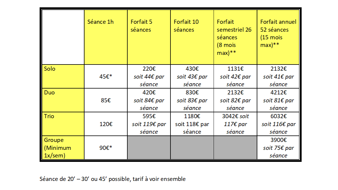 Tarif spécial pour les habitués réguliers, pratiquant depuis plus de 2 ans : 40€ Jarnac et 15km alentours. Au delà le barème kilométrique est appliqué, soit 0,30€ du kilomètre pour tous les kilomètres au-delà de 15km.